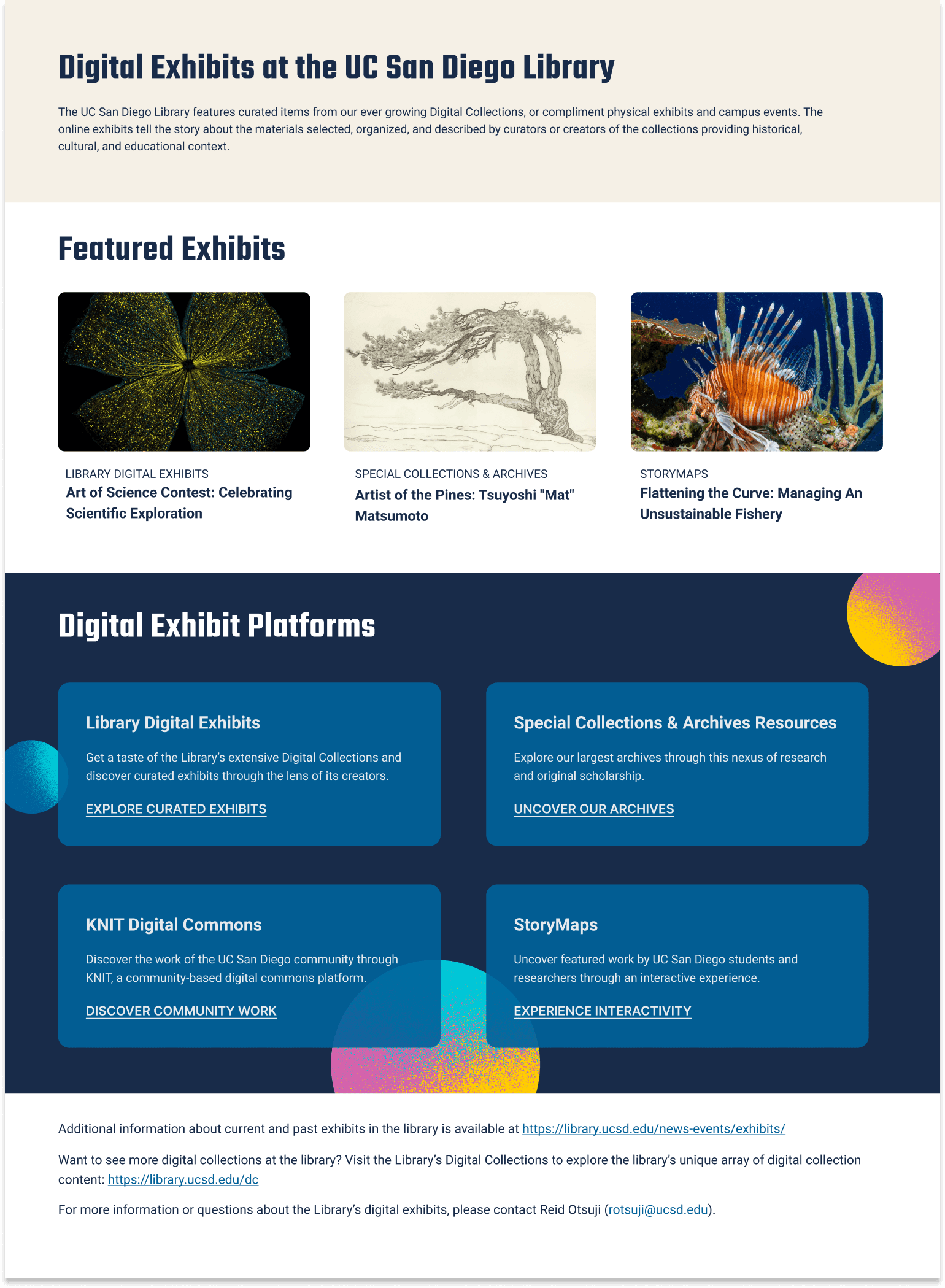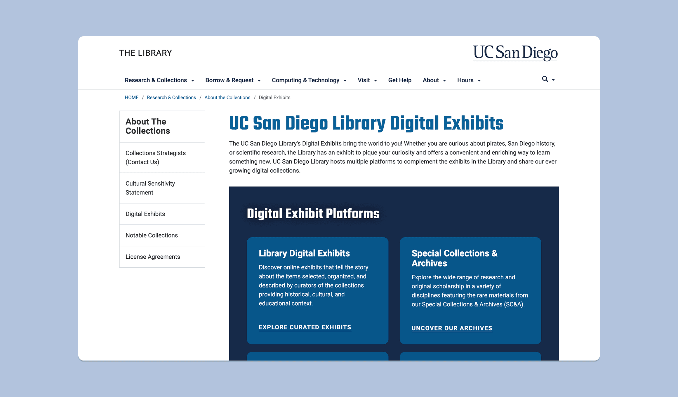 In an era where digitized resources are becoming increasingly preferred over their physical counterparts, it has become ever more important for libraries to have a digital presence. We created a landing page that hosts the 300,000+ digital collections the UC San Diego Library has to offer.