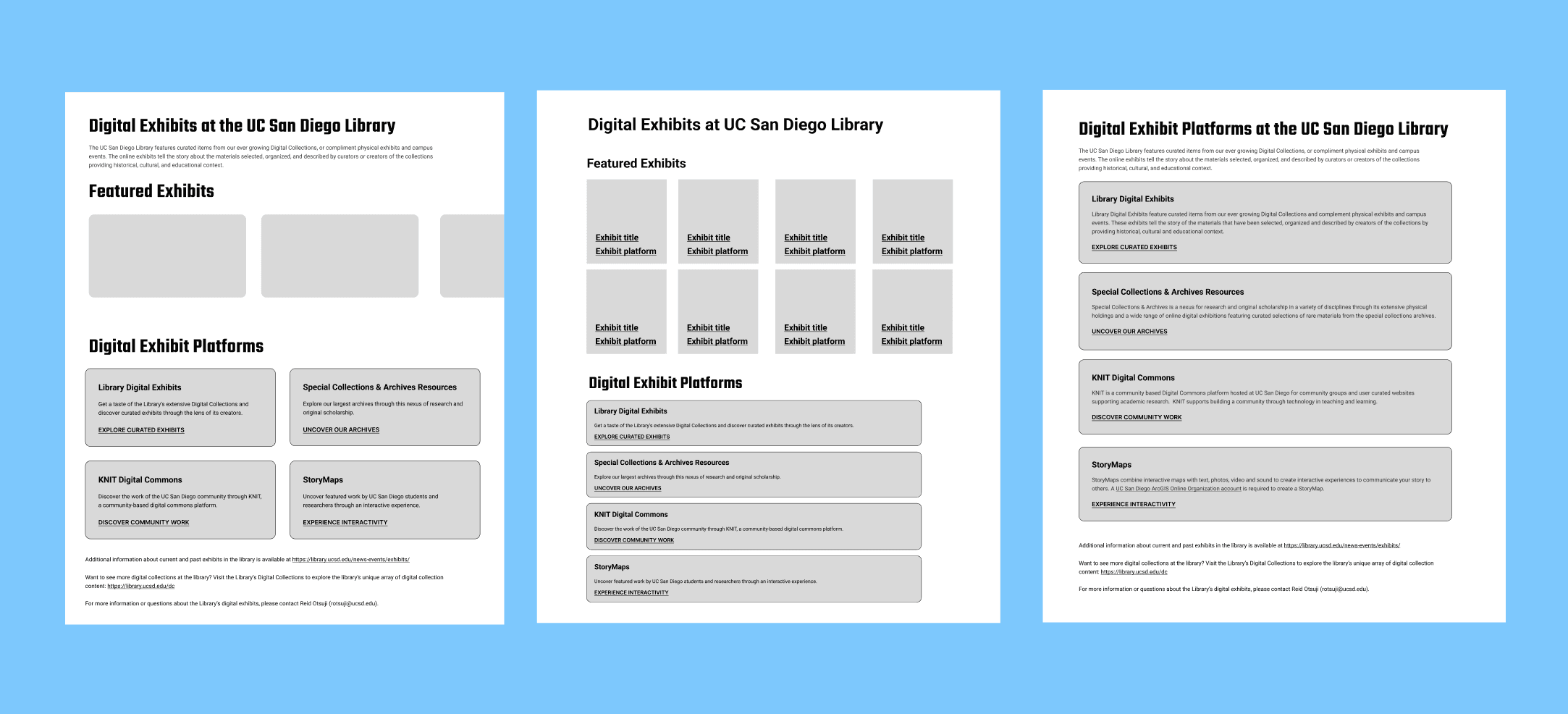 Wireframe time! Taking all the insights we gathered from our competitive analysis and user research, I began mapping out potential layouts for the digital exhibits landing page.
